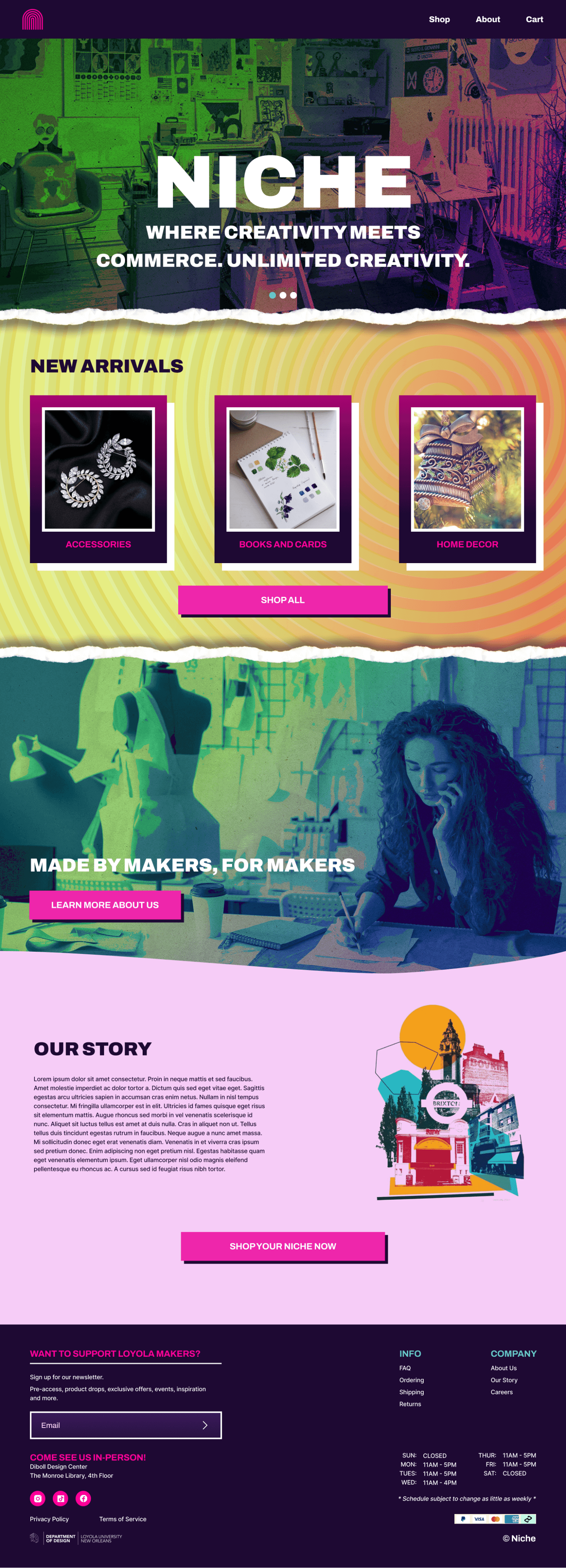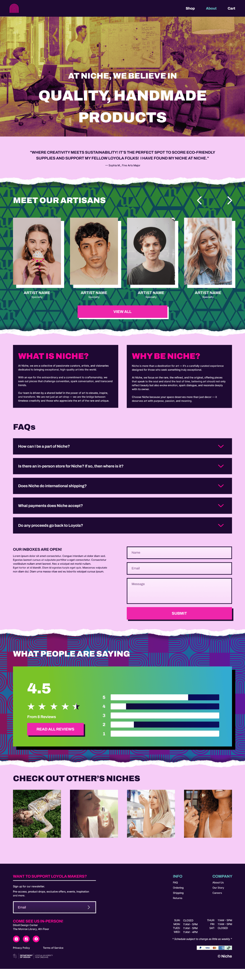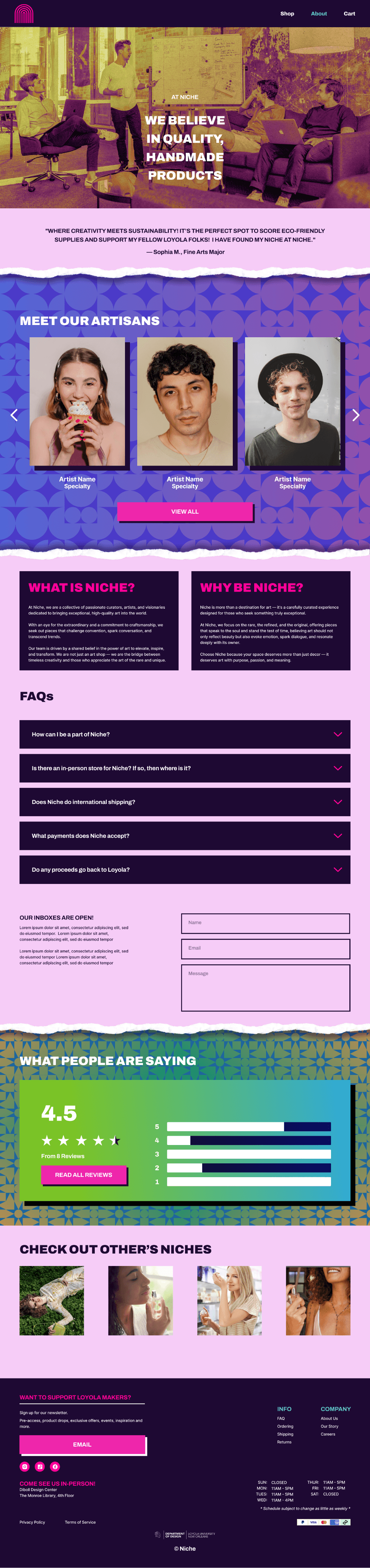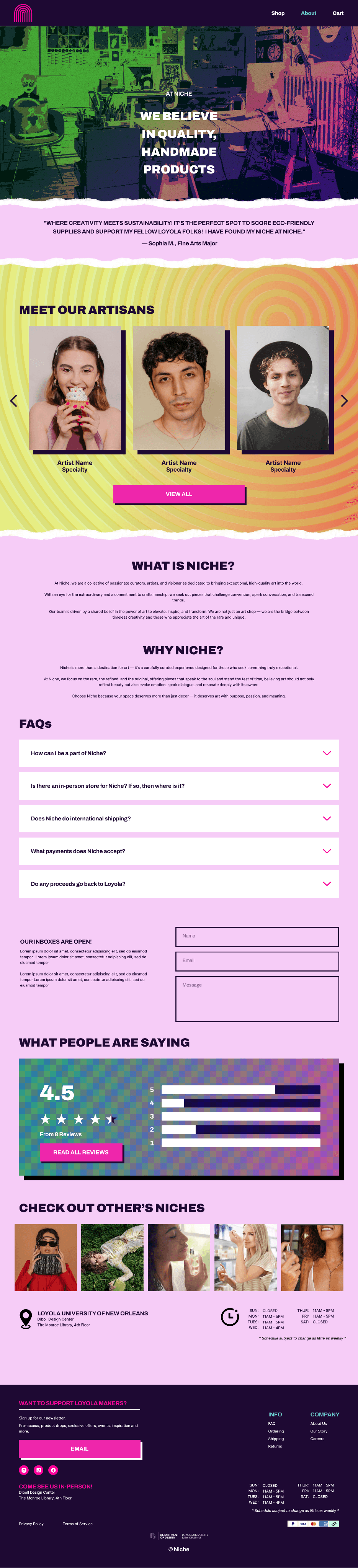 Create a website for our Loyola University New Orleans’ Niche shop, which specializes in selling handmade designs