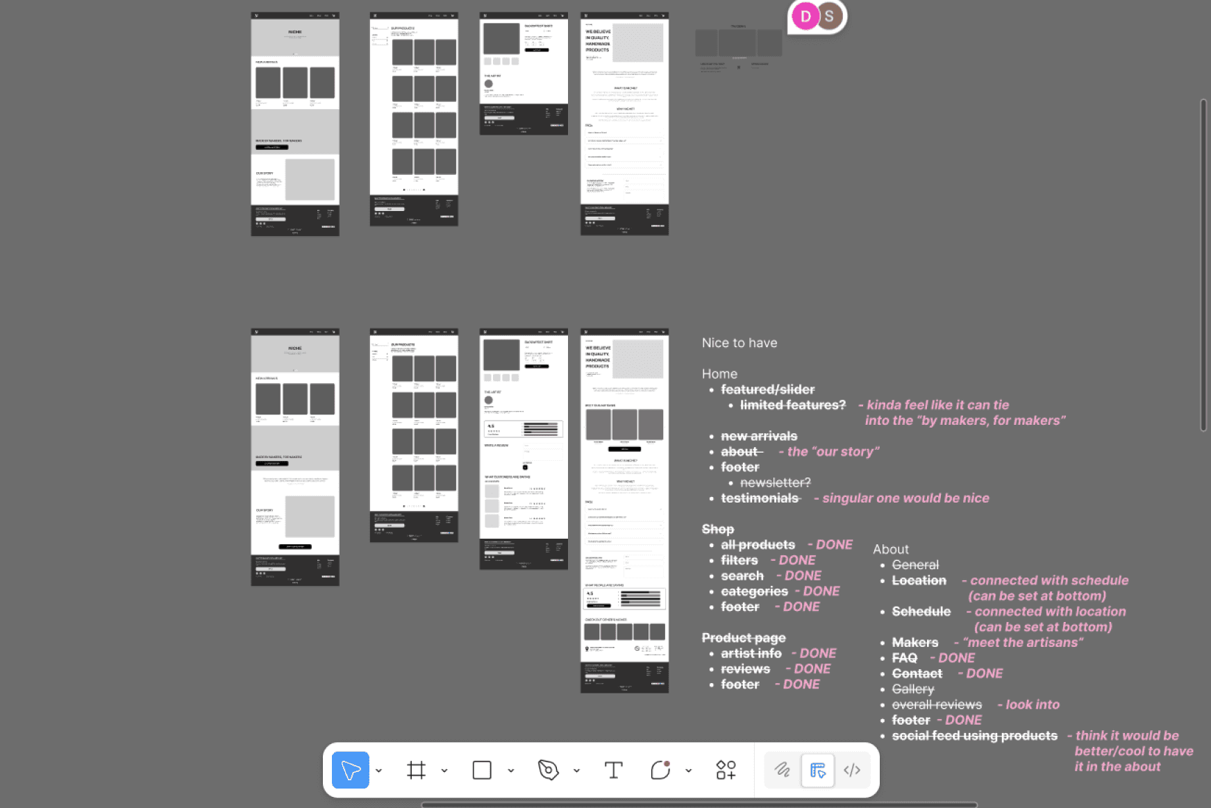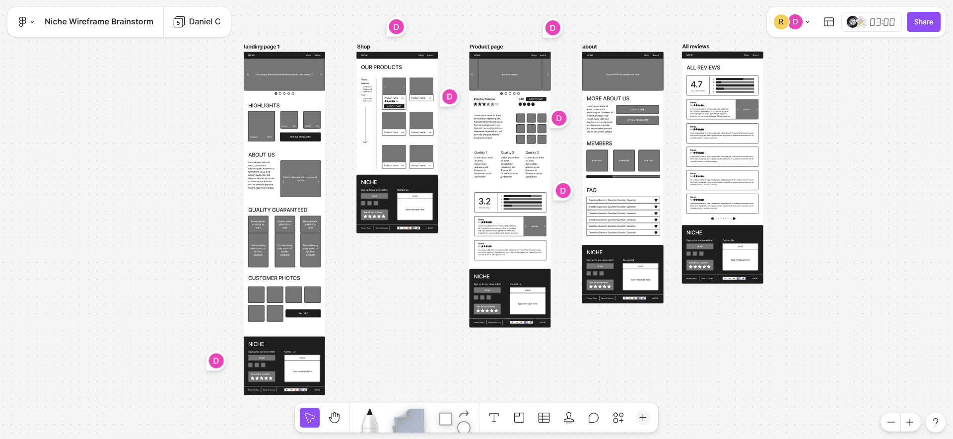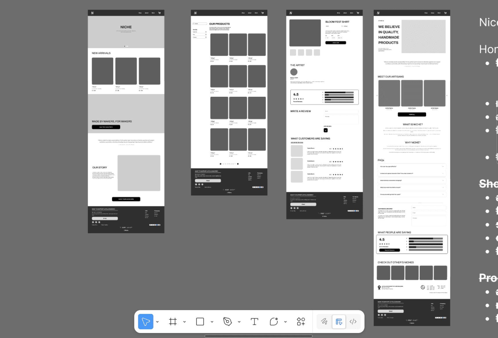 Initially, we planned to use a website builder like Squarespace to bring our prototypes to life. However, due to time constraints and the scope of the project being significantly narrowed, we instead finessed our prototypes for Niche to possibly reference someday.