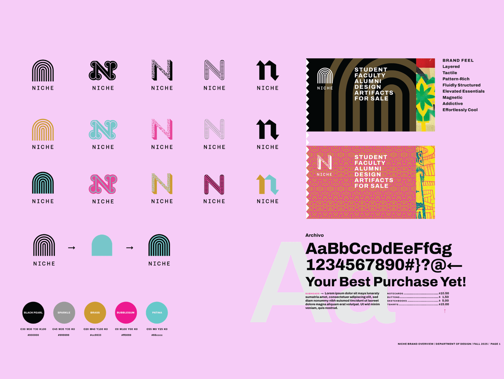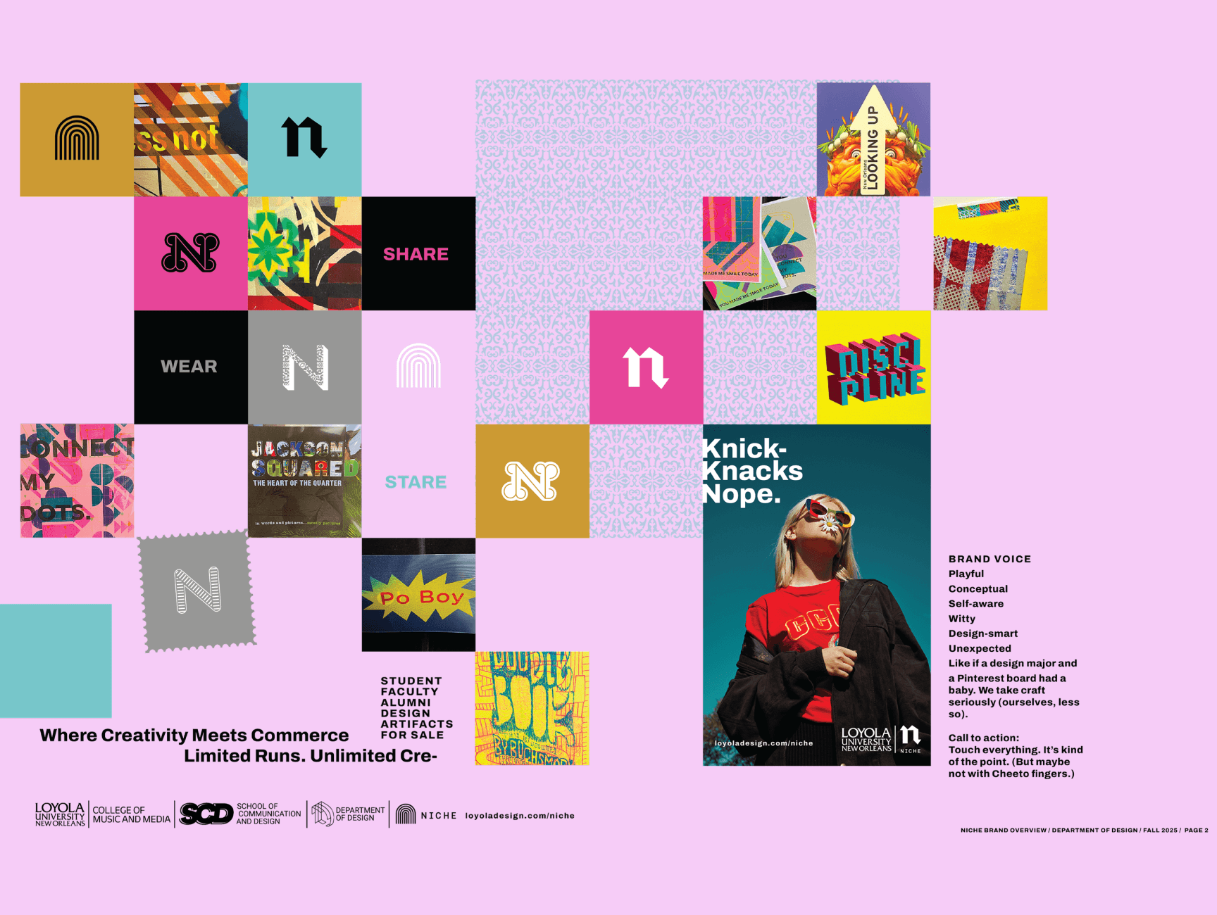 When we interviewed Professor Marx, we gained clearer insight into Niche’s brand. She envisioned a “high-end contemporary” feel that used layering, pattern and texture. Niche already had several logos, a color palette and a typeface we could experiment with. Our client wanted the brand to be positioned as a leader of design in New Orleans, appealing especially to people connected to Loyola or visitors seeking a souvenir from the city.