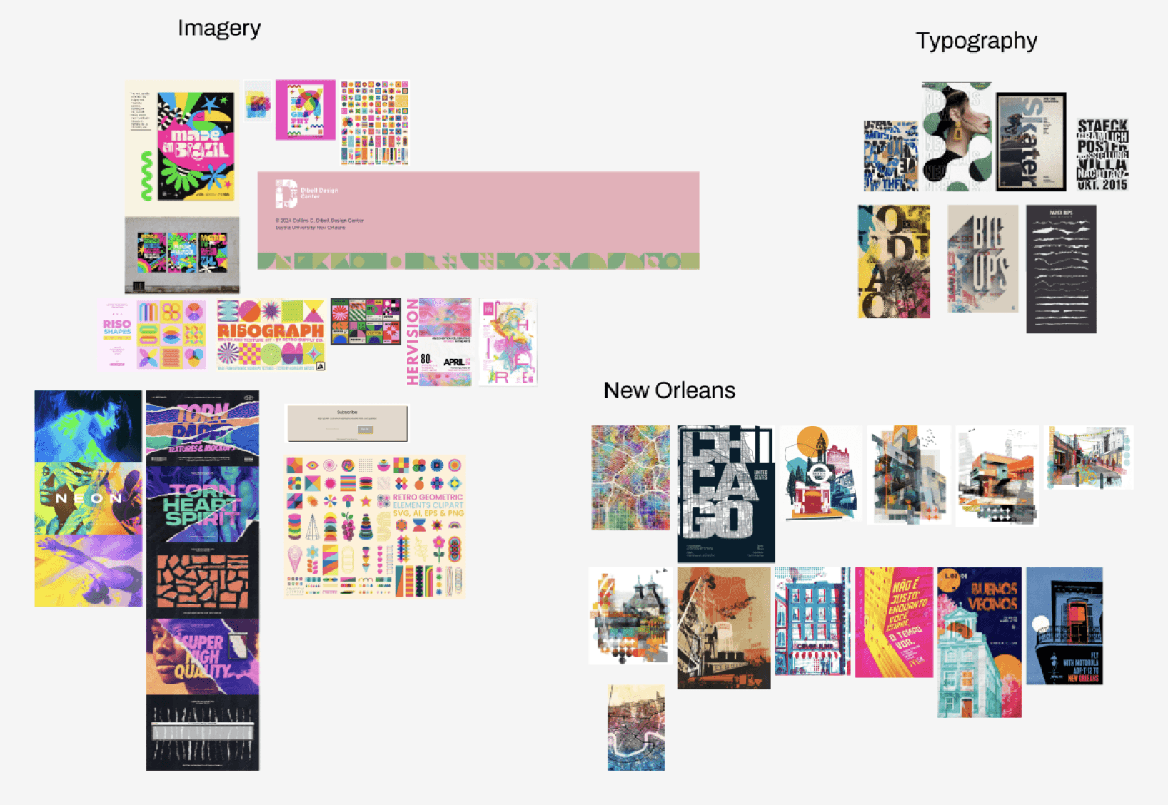 Before styling our wireframes, I created a moodboard to define the feel of my version. I was inspired to use geometric patterns instead of ornamental ones from the Diboll Design Center’s site. It’s a subsidiary of Loyola that our client told us to ensure Niche’s brand is cohesive with it. Because our school makes riso-printed designs often, I made use of saturated duotone imagery and paper textures. These textures would make the site feel tactile and emphasize the handmade nature of Niche’s products.
