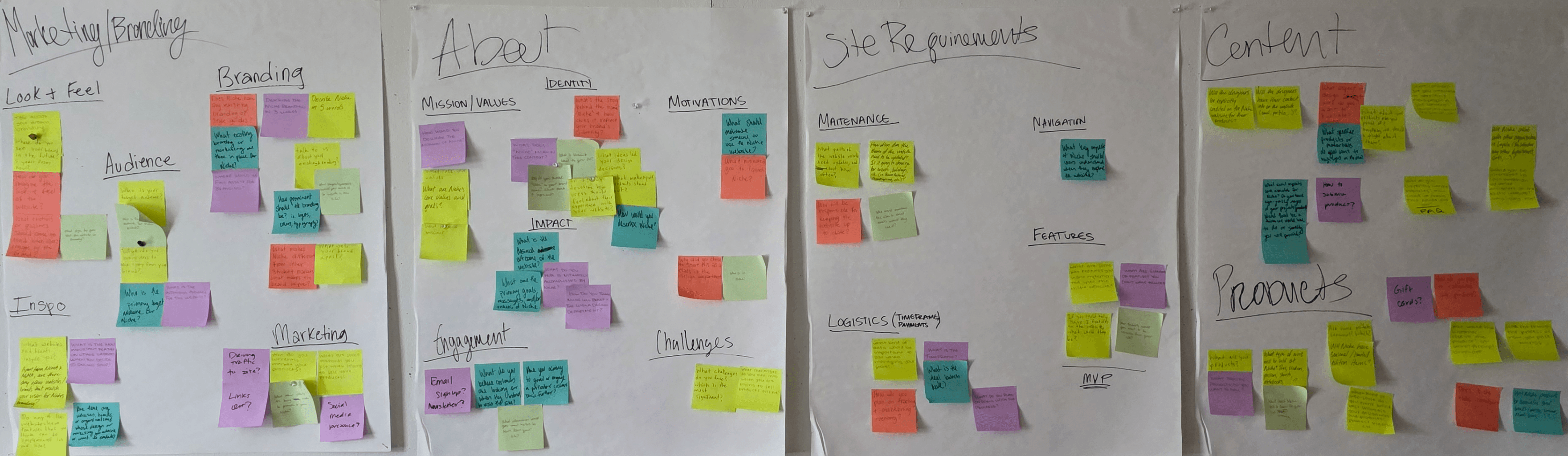 Our team understood that Niche needed basic e-commerce features but didn’t know their products or brand. We would also have to wait several weeks to meet with our client and learn more. When that time came, we received a brand guide with logos, fonts, colors, and brand descriptors, though there were no strict requirements.