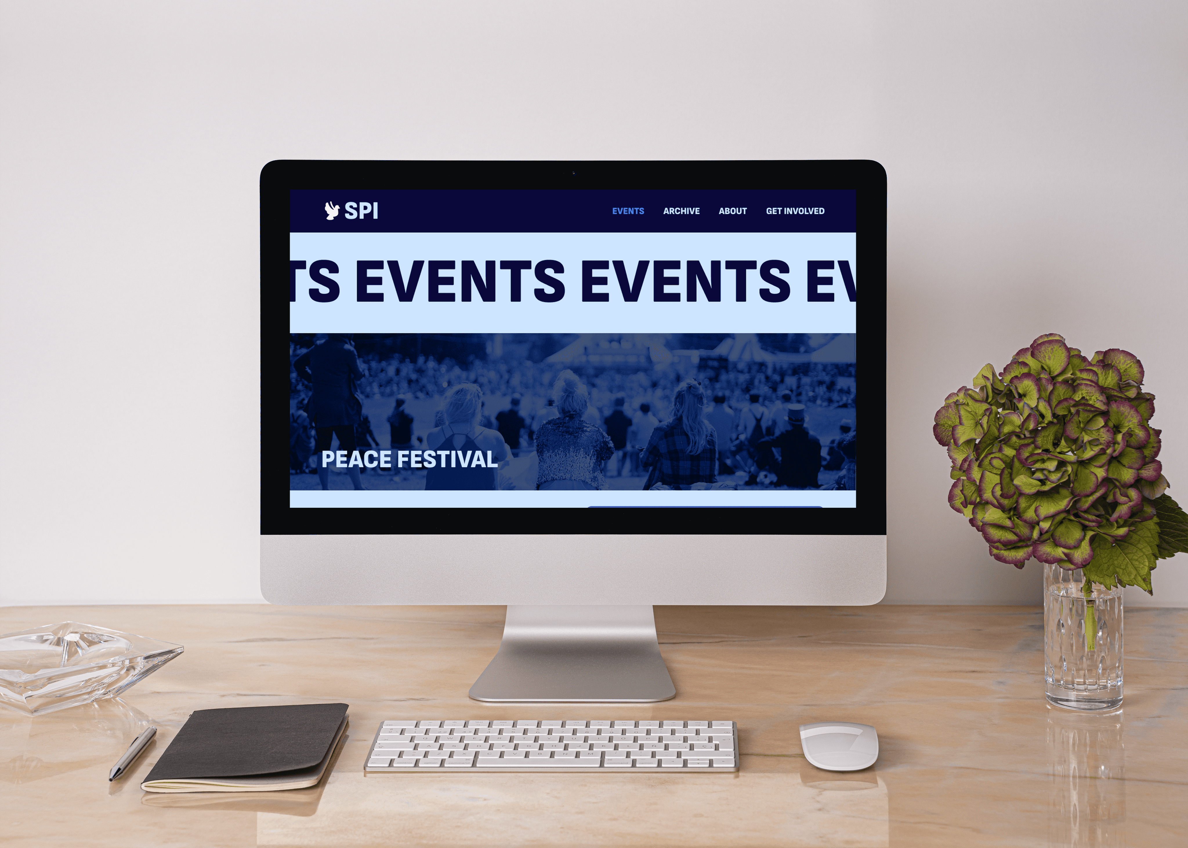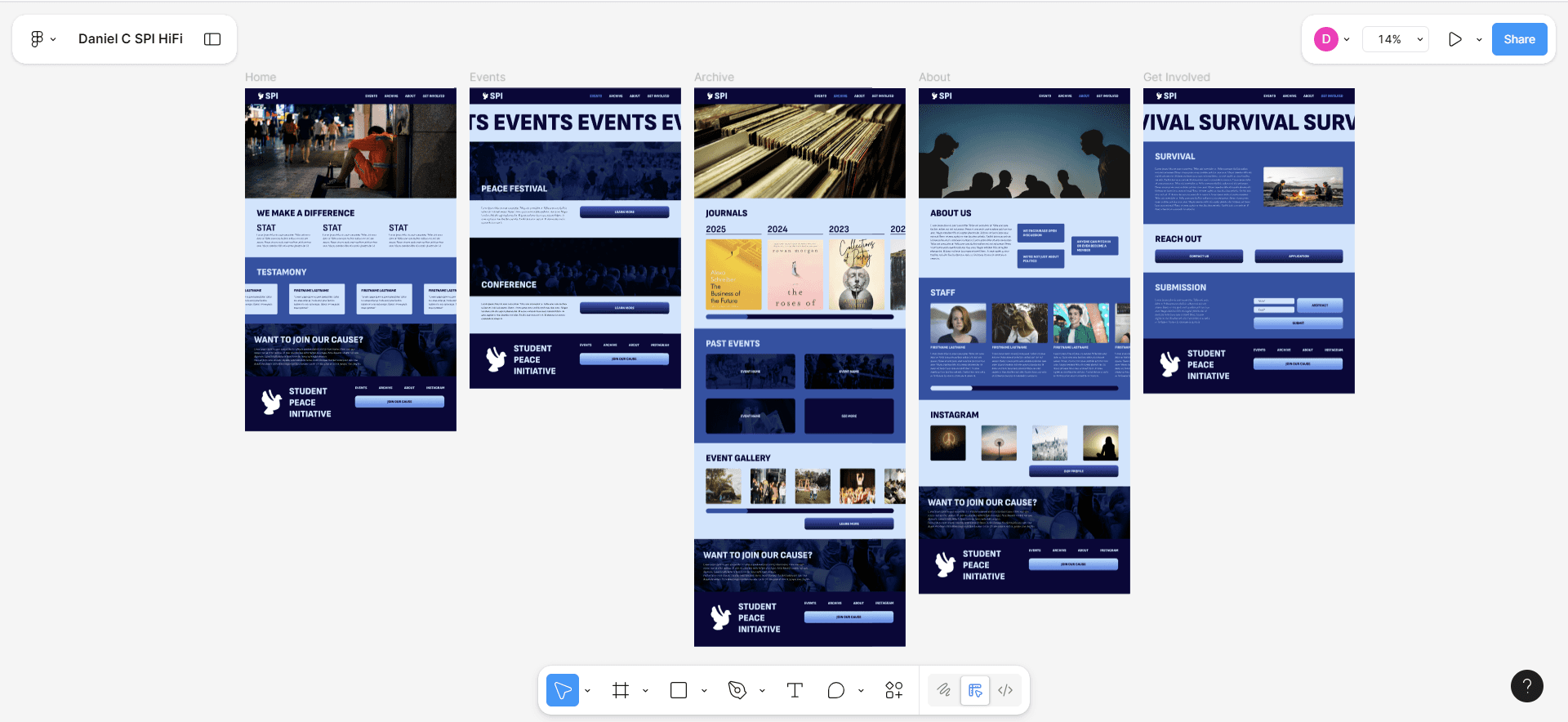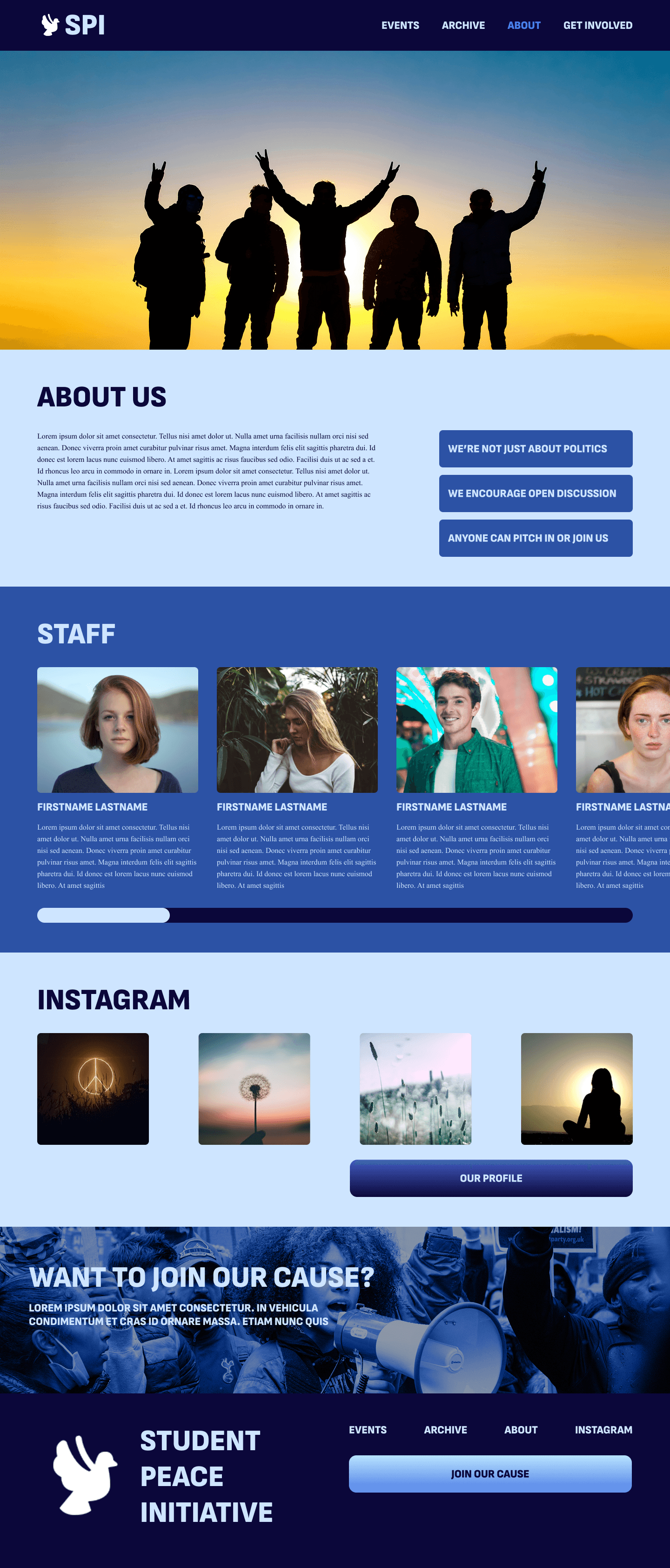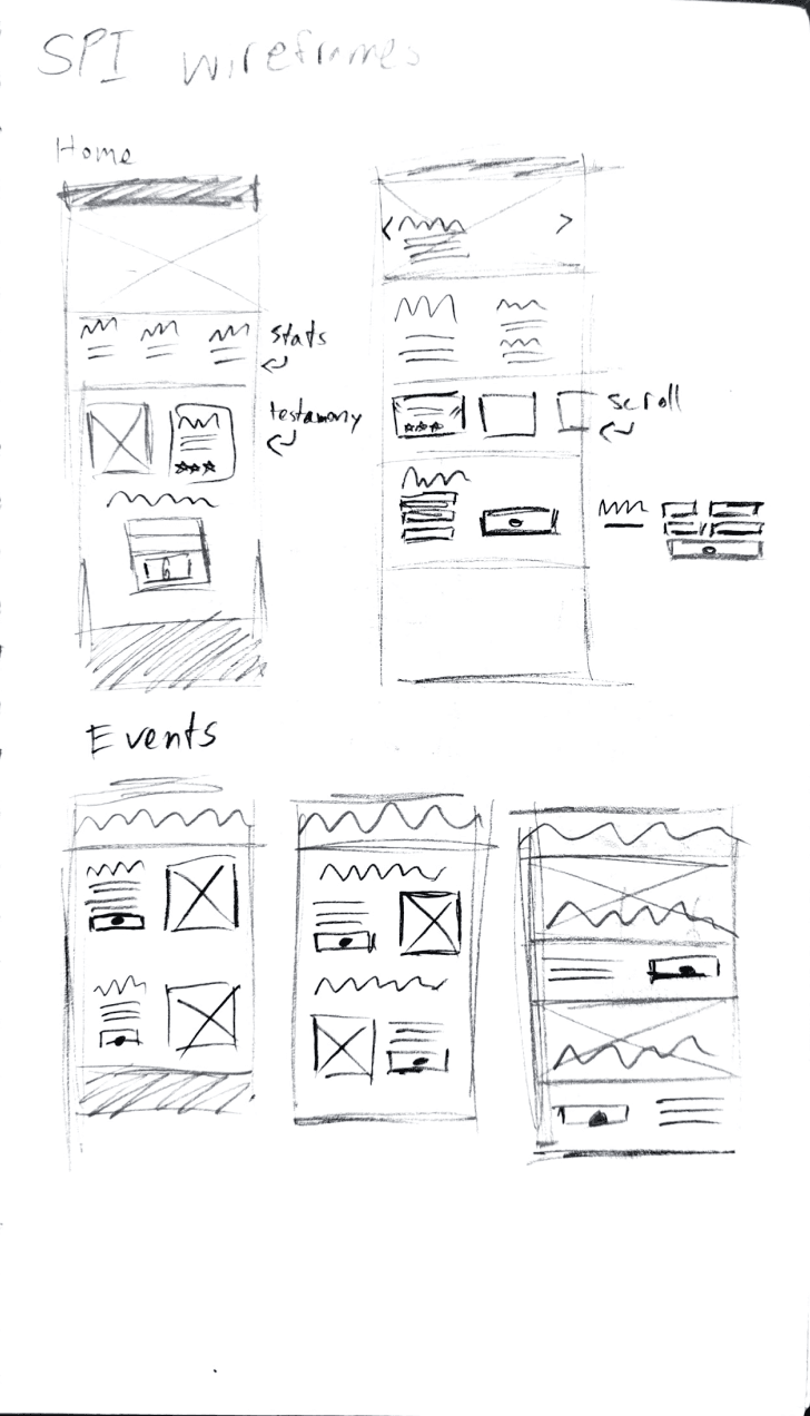 Going into the design process, I focused on emphasizing SPI’s impact and credibility to drive engagement. That’s why the landing page features several statistics and testimonies. I chose a monochromatic blue palette to convey trust and create a welcoming feel. Because SPI told us users often confused SPI’s festivals and conferences, I included descriptions on the events page. Three qualities the board members wanted people to know about SPI were that anyone could join, they’re not always political, and they encourage open discussion. I wrote these facts beside their About Us description for emphasis.