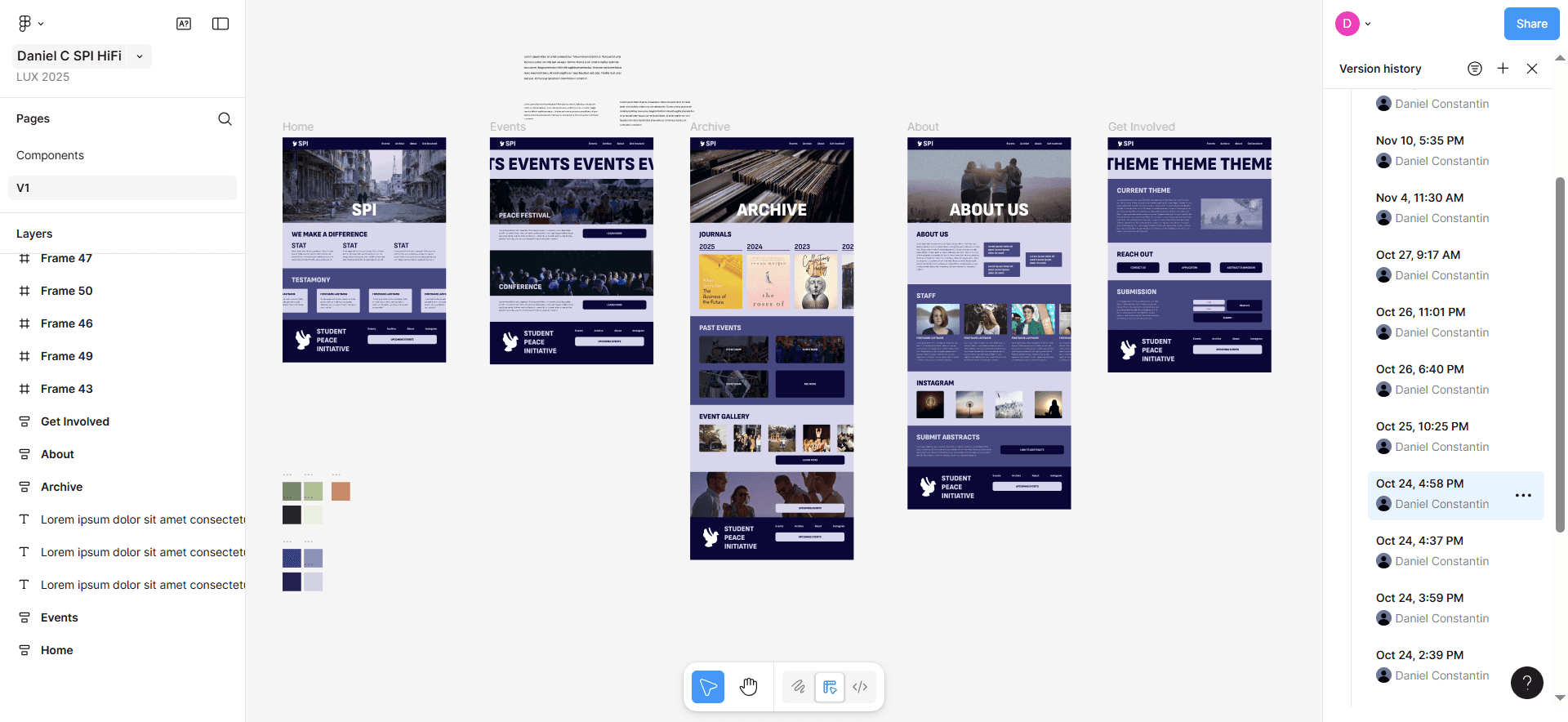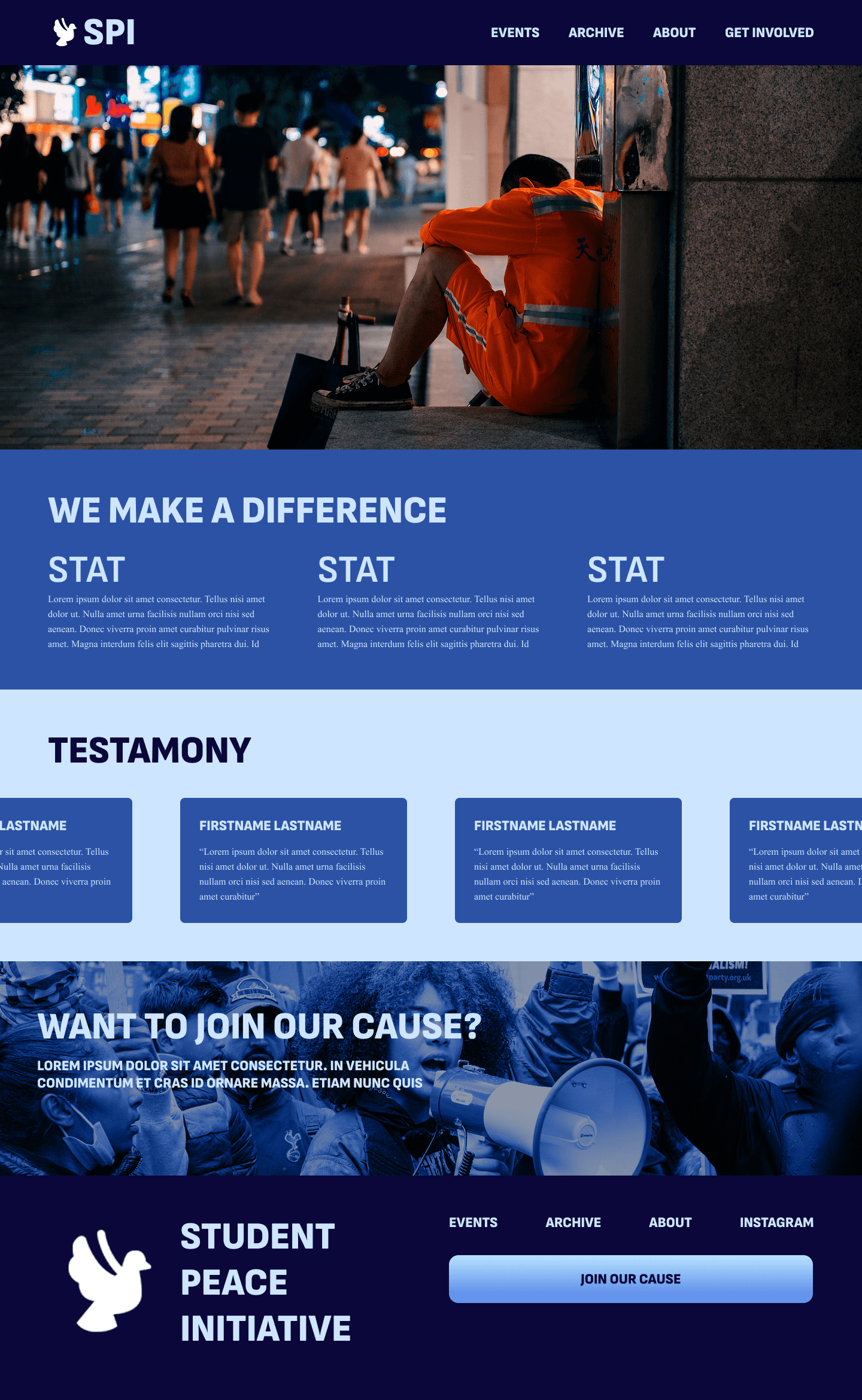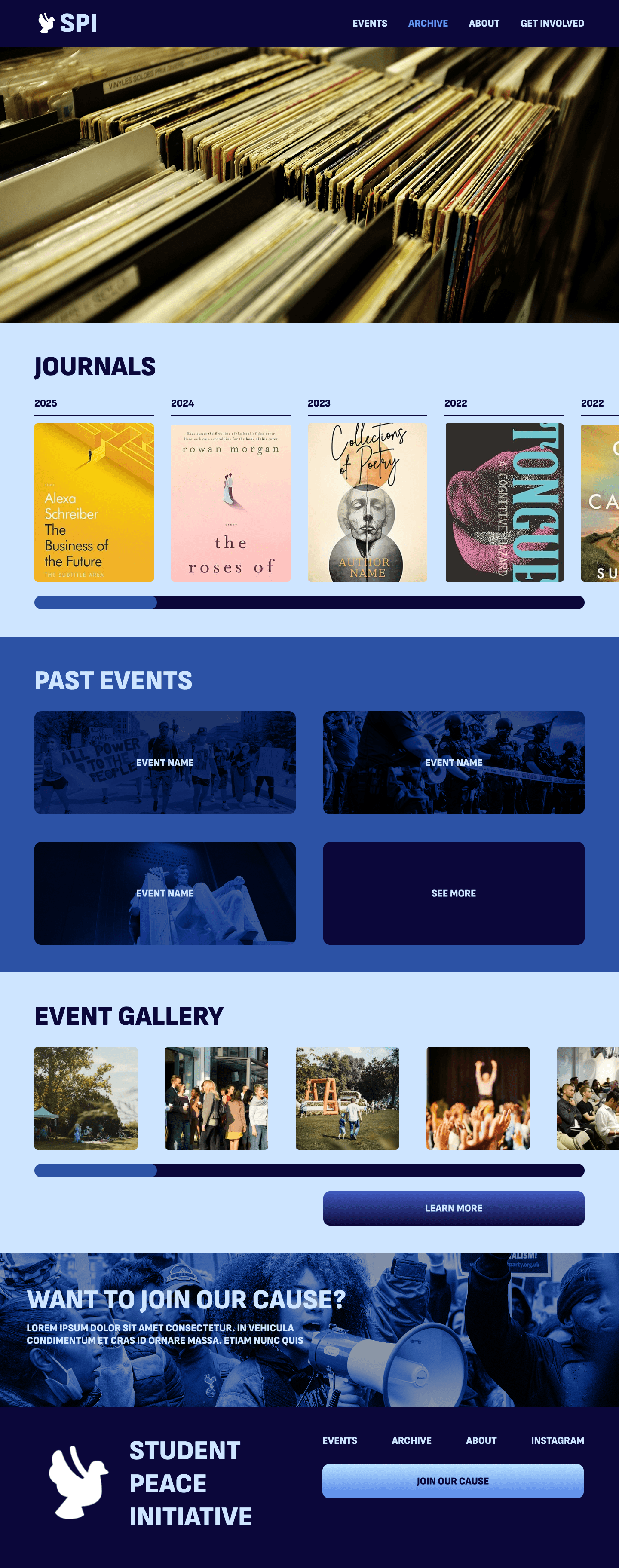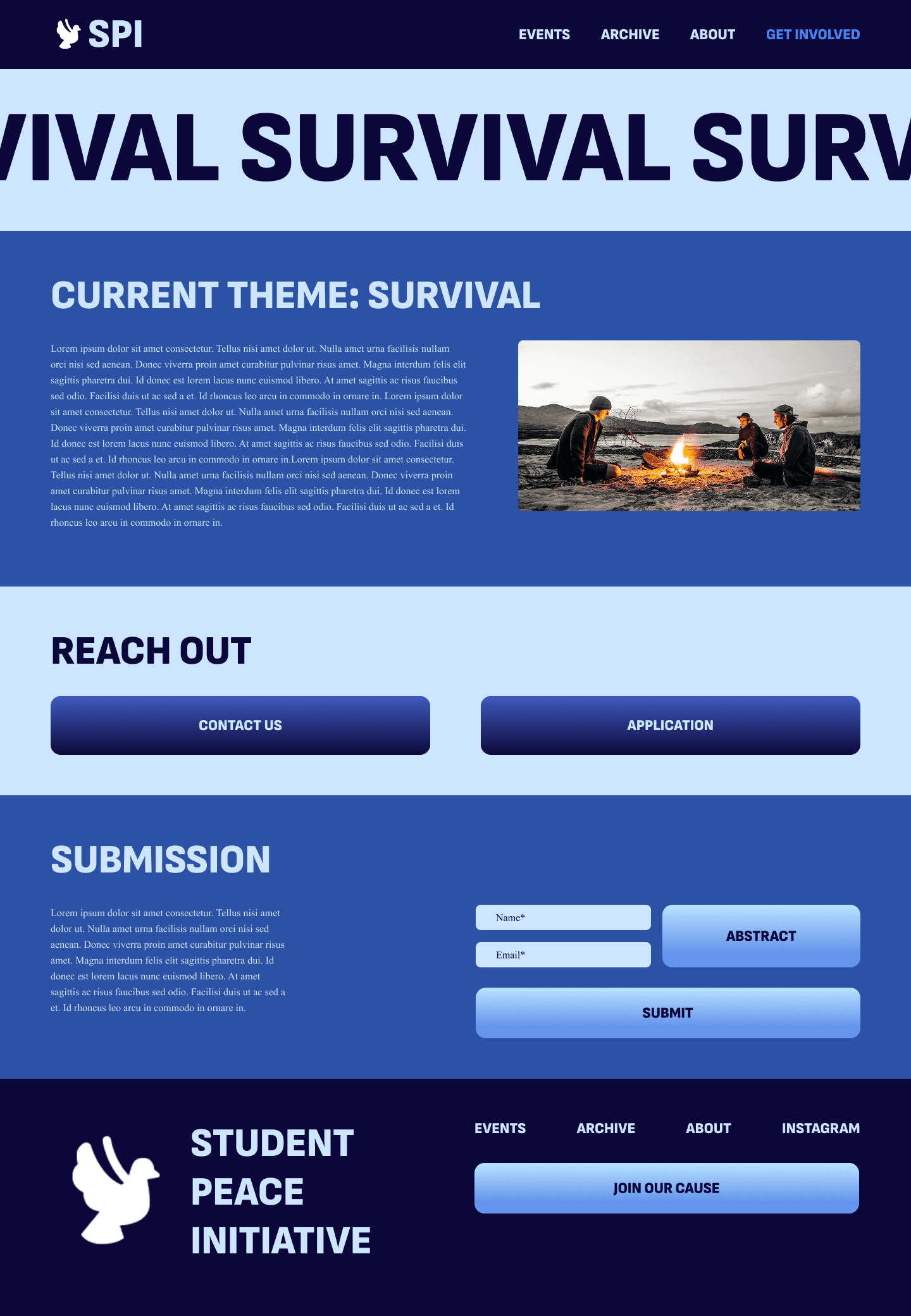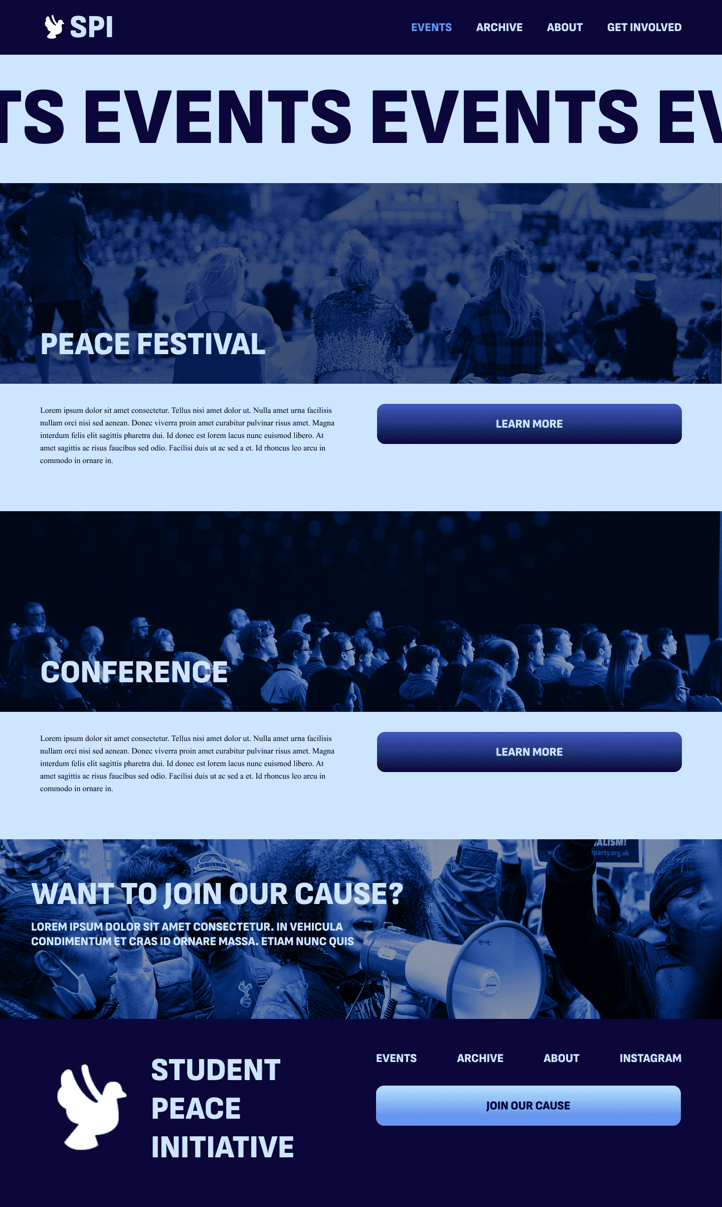 When we met with the Student Peace Initiative a couple weeks later, we narrowed down their audience to participants, observers, and outside organizations. Their top priority was encouraging abstract submissions, so each semester’s theme had to be prominently featured. They also wanted to archive past events, highlight upcoming ones, share their history, include testimonies, and feature key members. While they left the style to us. they favored bold interfaces with dynamic elements like scrolling type. Because SPI planned to eventually separate from Loyola, the site also needed a distinct identity.