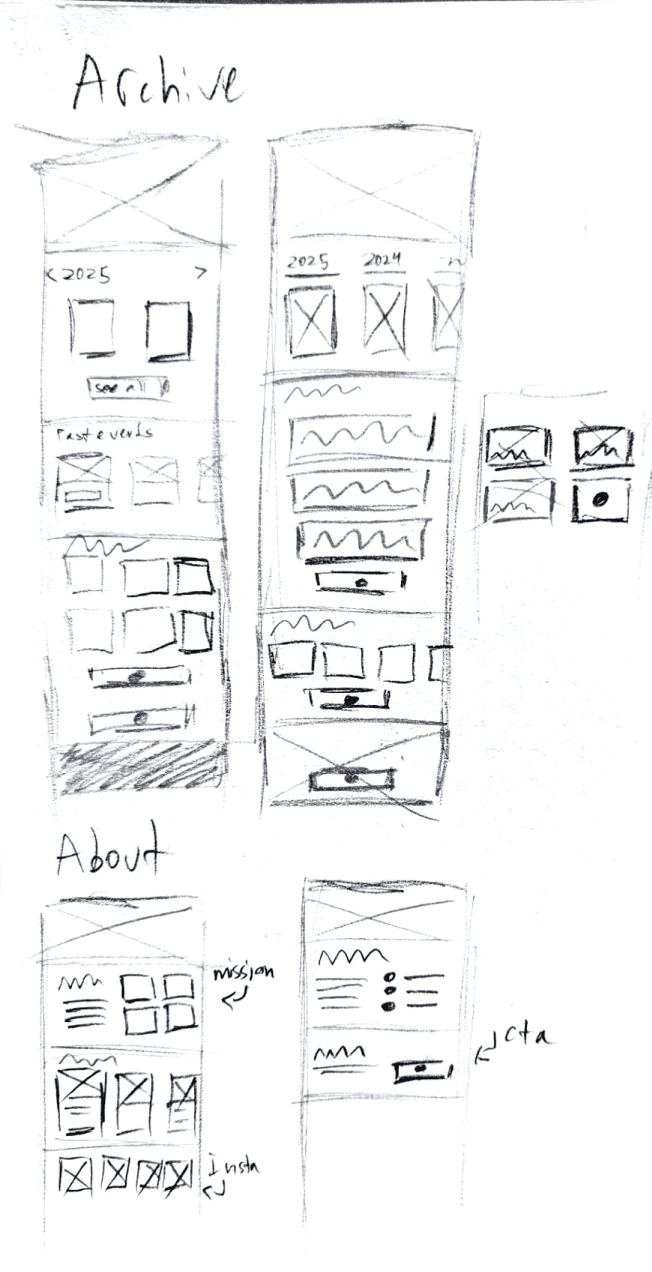 The board liked the Instagram integration, journal layout, and event descriptions. My instructor approved the dedicated theme section and highlighted qualities beside the About Us description. However, he noted that the blue images were too dark, which also made the CTAs blend into the footer. In my final iteration, I addressed these issues and ensured sections like Journals and Staff fit fully on screen.