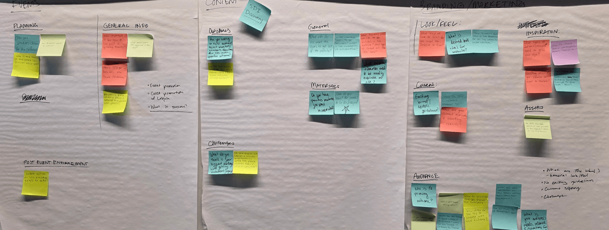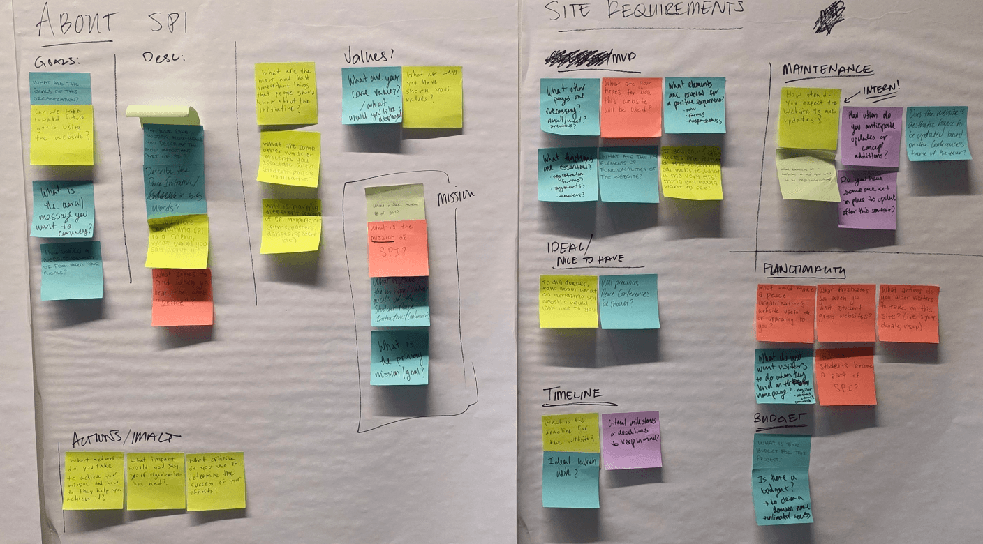 To understand SPI’s needs, our team came up with several questions for the board members. We drafted questions individually, then consolidated them by identifying common themes and merging or removing duplicates. Some of the questions that proved particularly useful were: